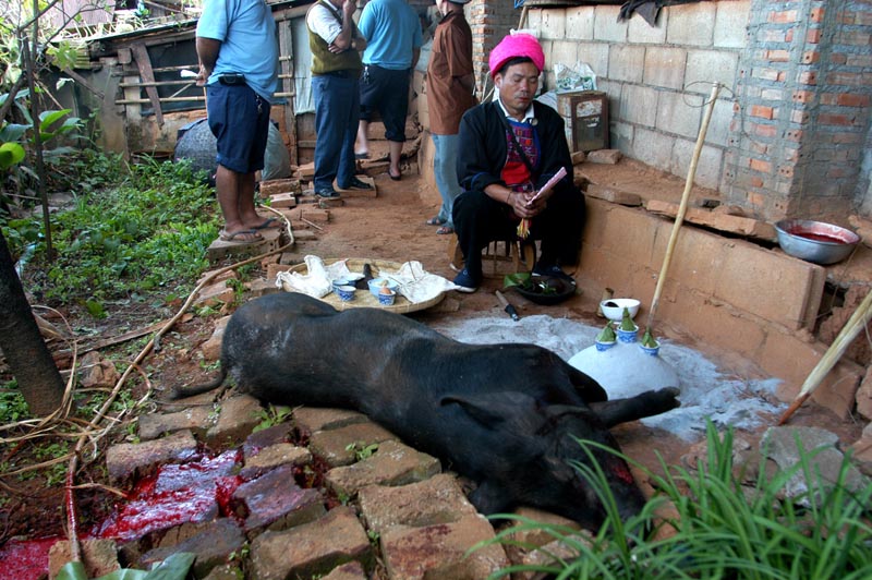 | The phi ma chants for some time over the ash mound, a small table with some food as offerings, and the corpse of the pig. Eventually the pig will be butchered and eaten, but not yet. The eggs each are given to a member of the family and they take it home as a symbol of good luck, to be eaten later. |